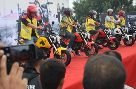 摇滚乐队的激情演唱还在牢牢锁定观众的目光,远处轰鸣的马达声已经响起.顷刻间,五辆颜色各异的大公仔在骑士的驾驭下直线加速,直奔台上!这是全国各地大公仔发布会召开以来,大公仔最为”拉风”的一次出场!
