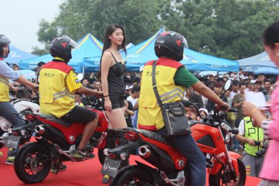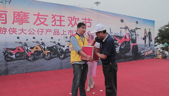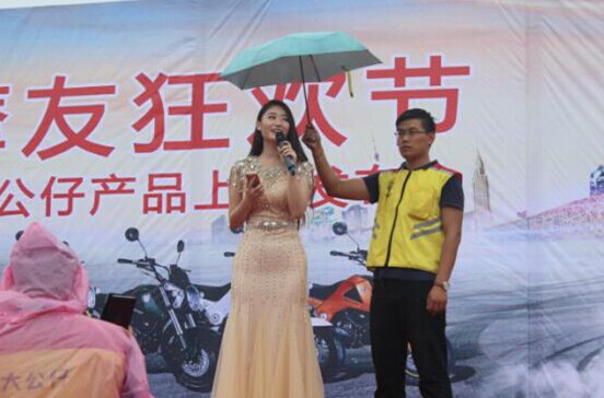 在摩友们的欢呼喝彩声中,津沙摩托代言人岳丹阳小姐现身台上,为故乡的摩友献上了与大公仔的首秀并正式的完成了携手津沙代言的签约仪式.