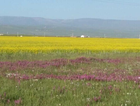 辽阔起伏的千里草原上点缀着星星点点的牛羊,与先前的苍茫戈壁不同, 夏季的大草原,绿菌如毯。金黄色的油菜,迎风飘香;牧民的帐篷,星罗棋布;成群的牛羊,飘动如云.